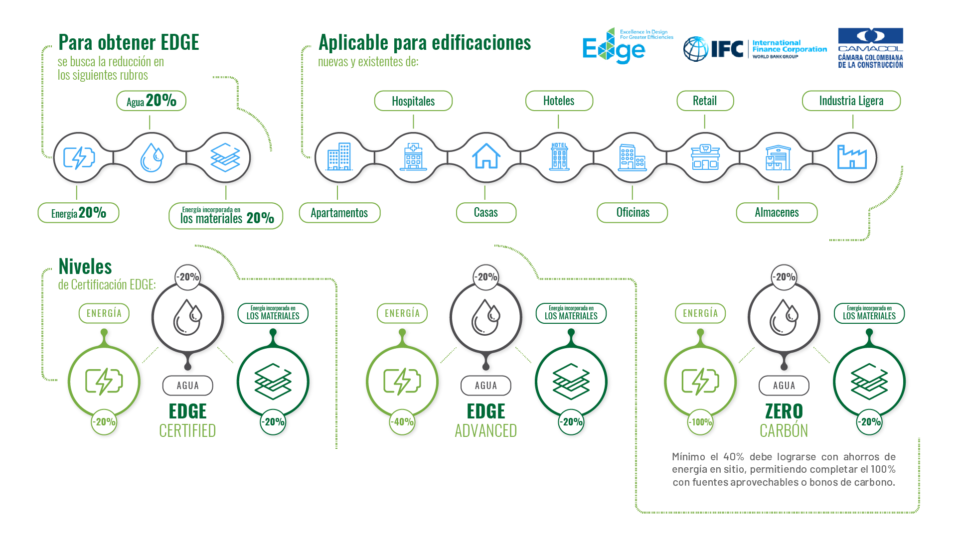 Excellence in Design for Greater Efficiencies, es un sistema de certificación de edificios ecológicos que permite al mercado Inmobiliario colombiano construir de manera sostenible. Una innovación de IFC, miembro del Grupo del Banco Mundial, EDGE hace que sea más rápido, fácil y accesible que nunca construir una marca verde.